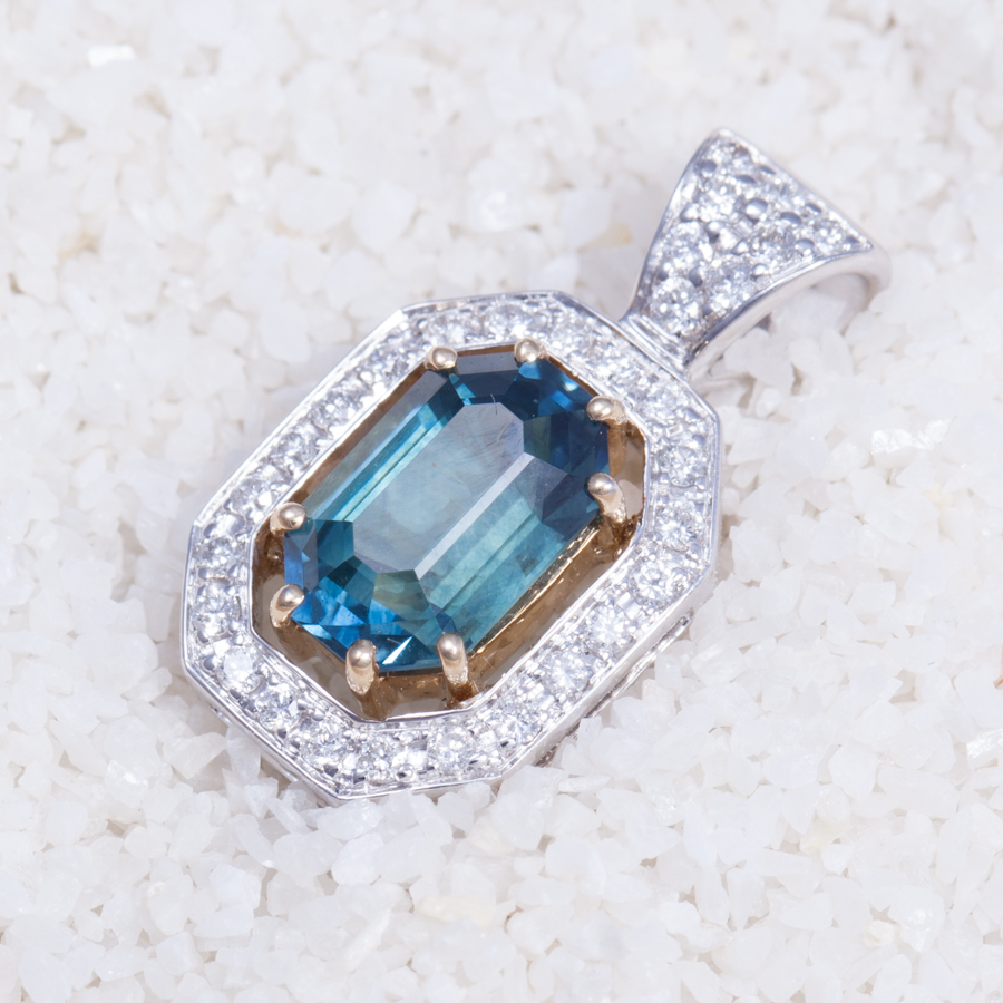 2.24 Rock Creek emerald cut blue, almost teal sapphire complimented by 1.24 carats of diamond with both 14kt white and yellow gold. Extraordinary piece of jewelry!